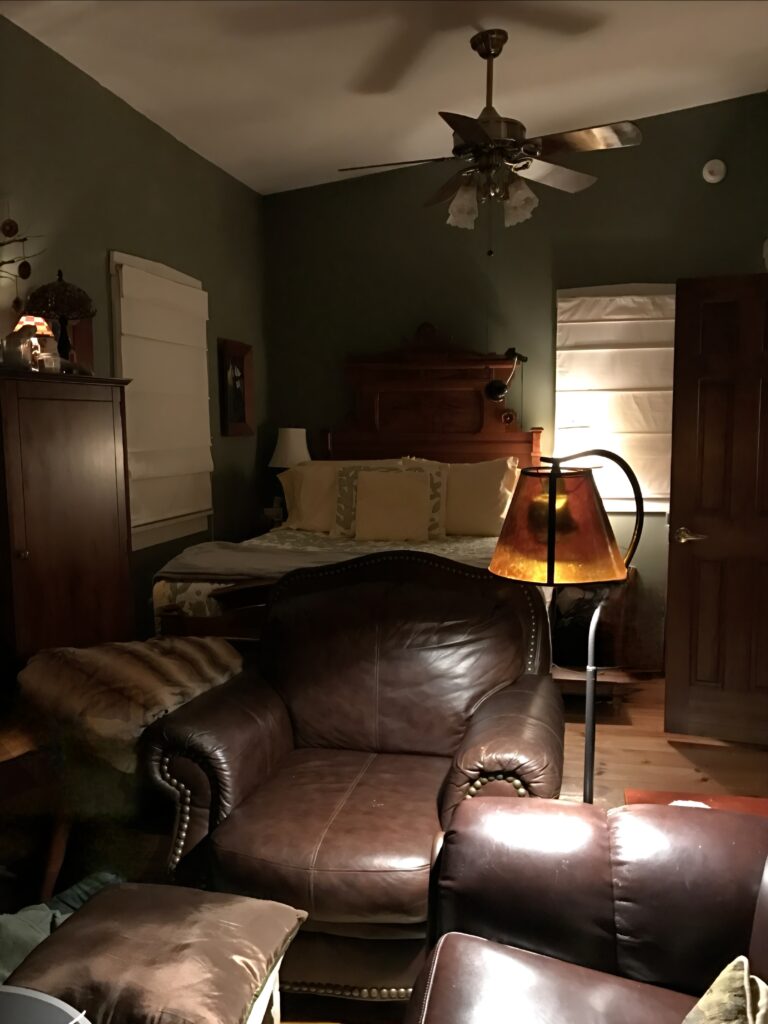 The ceiling is a spacious 11 feet high in the front of the building sloped to 9.5 feet at the back. There are two high-quality casablanca fans with five lights each. The floors are wide-plank knotty pine and the walls are painted a relaxing moss green. The Cottage has central heating and air conditioning and a high-capacity water heater in the basement storage/garage area beneath.